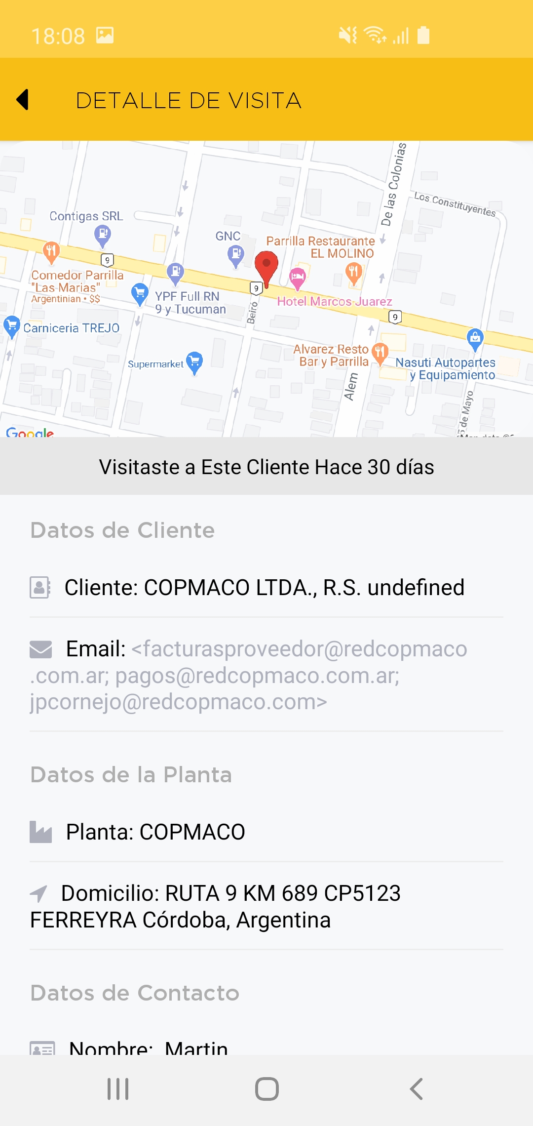 Project Description DinaApp is an internal App developed exclusively DINATECNICA for tracking salesmen's agendas and daily visits. The app uses Google's geolocation API to track the coordinates of each report, which can be reviewed by the company for internal auditing. Users can write summaries of their visits using customized forms for each business unit, and can add photos, comments, and schedule new visit dates. DinaApp integrates with the company's internal database through an API, allowing for real-time tracking of visit reports.