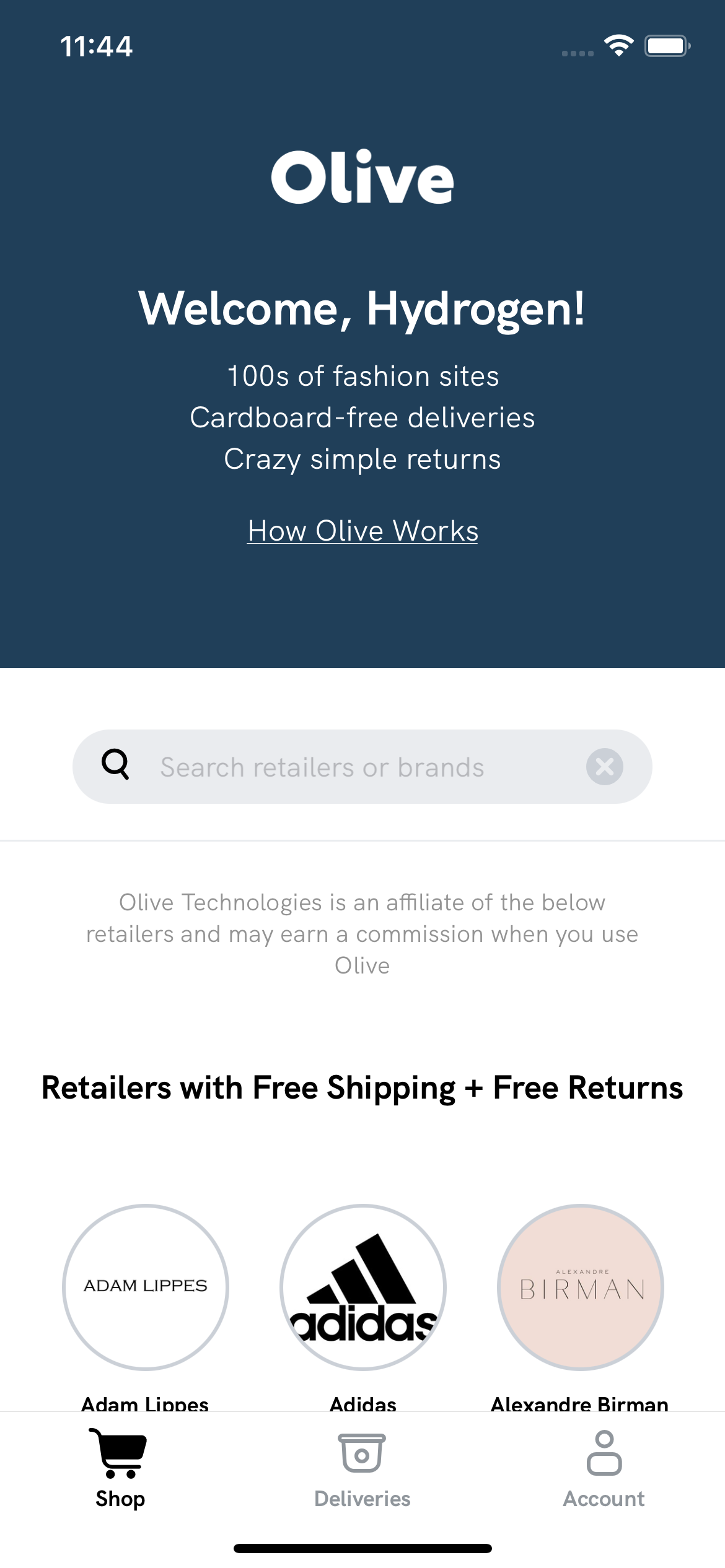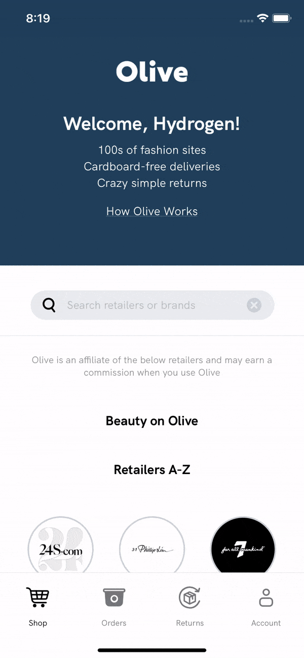 Project Description: Shop Olive is a mobile app that allows customers to buy, return, or consign clothing from top US fashion retailers. The app features hundreds of retailers whose websites can be accessed within the app or through a Chrome extension for desktop users. Once an order is ready to be placed, the app prompts the customer to accept their automatically populated "Olive address" (the nearest Olive distribution hub based on the user's zip code), and the order is placed automatically. It offers an auto-checkout and payment experience and customers can then view their orders, return or consign items, and track their orders with real-time updates.