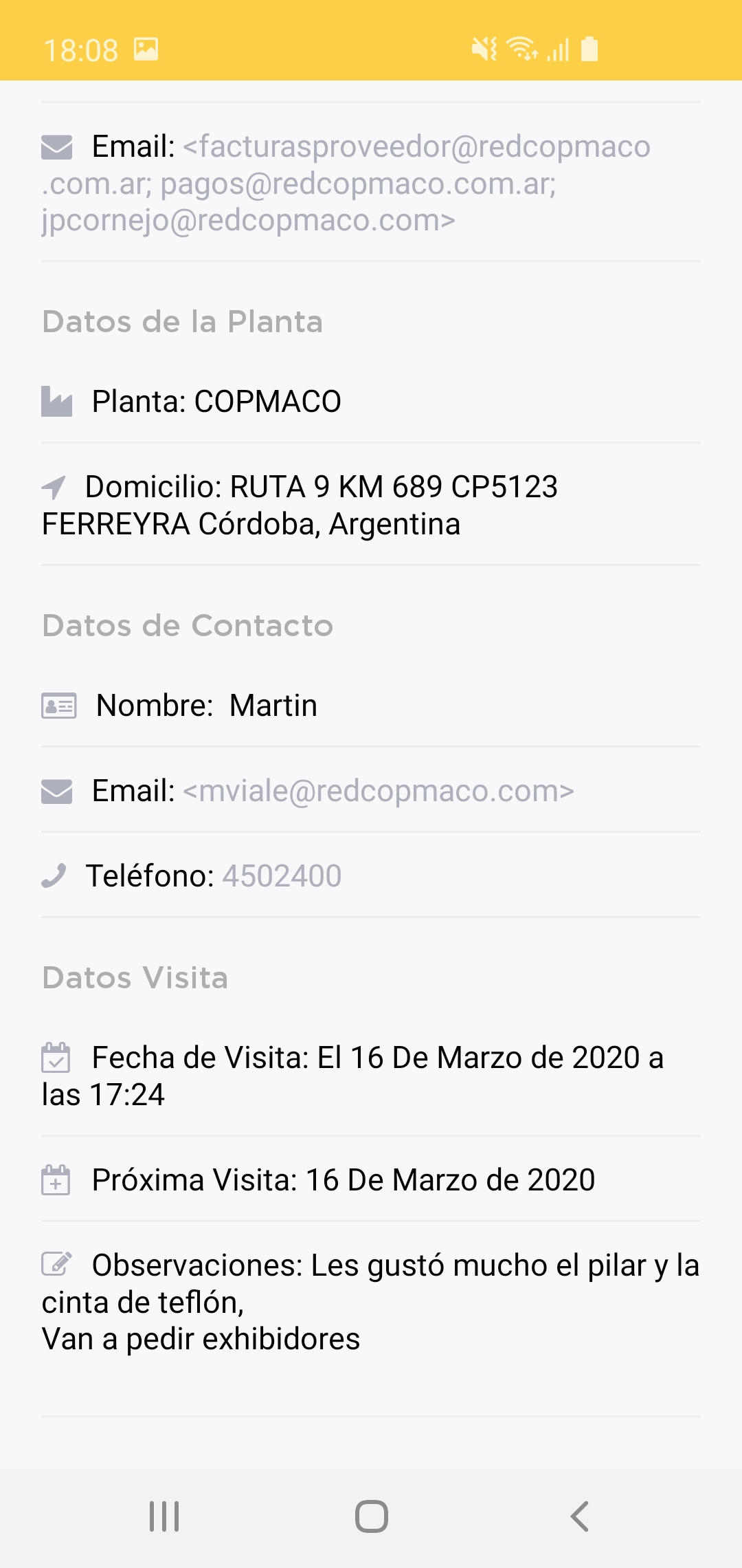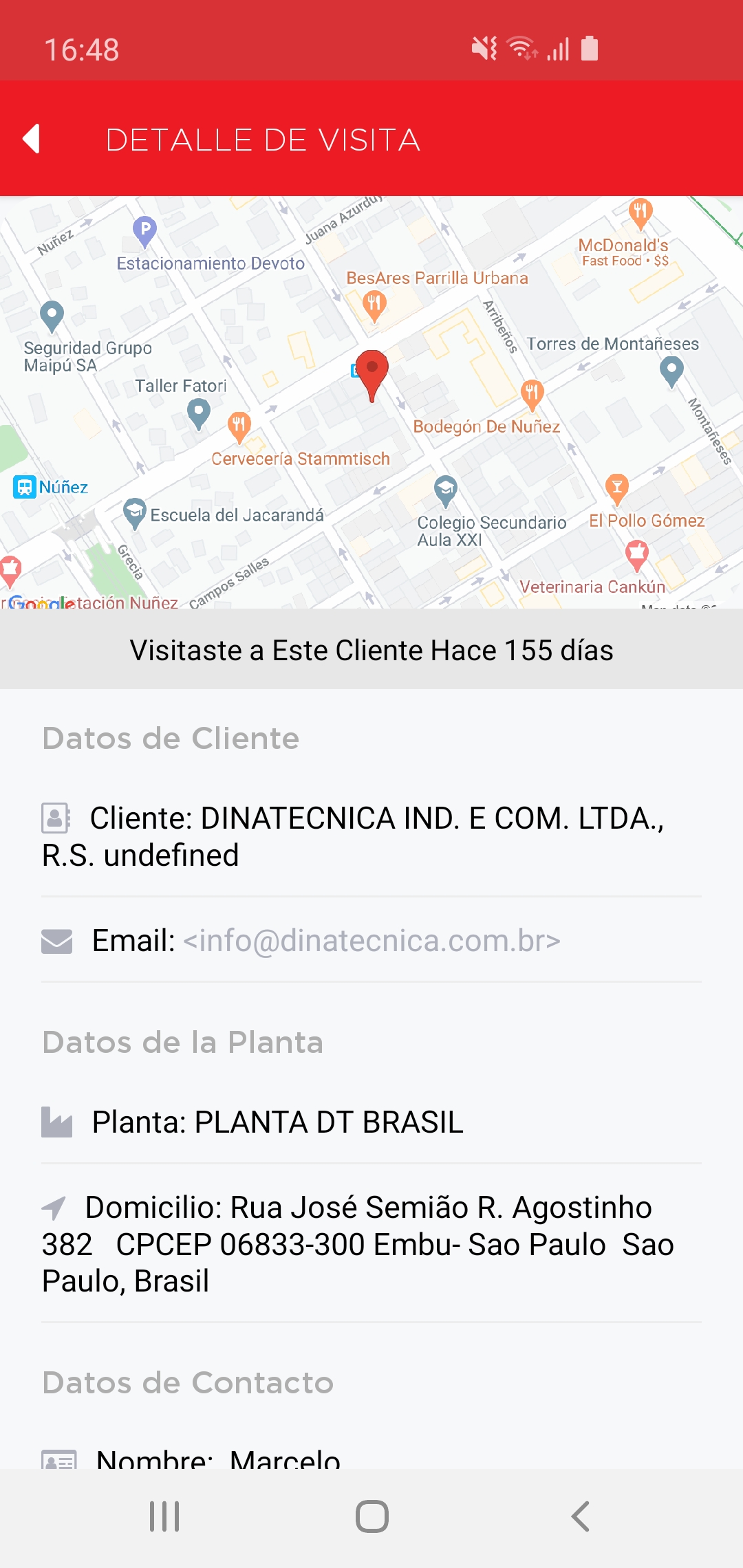 Project Description DinaApp is an internal App developed exclusively DINATECNICA for tracking salesmen's agendas and daily visits. The app uses Google's geolocation API to track the coordinates of each report, which can be reviewed by the company for internal auditing. Users can write summaries of their visits using customized forms for each business unit, and can add photos, comments, and schedule new visit dates. DinaApp integrates with the company's internal database through an API, allowing for real-time tracking of visit reports.