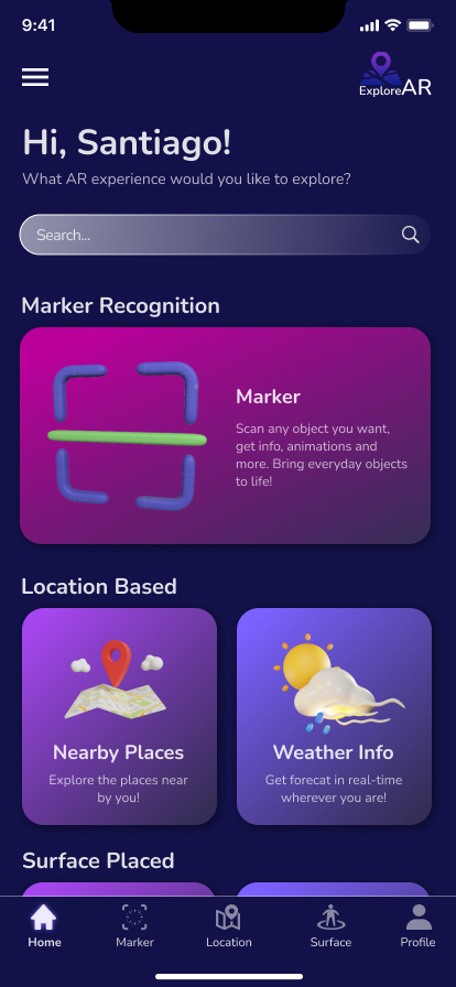 Project Description: ExploreAR is a proof-of-concept mobile app that uses augmented reality (AR) to demonstrate the potential of AR experiences on react-native apps. We developed the app using the React Viro Library. It showcases surface-based AR, marker recognition, and location-based experiences. The goal of the project is to show the possibilities of using AR in react-native projects. The app is currently in its final testing phase and will be available soon on Android and iOS stores.
